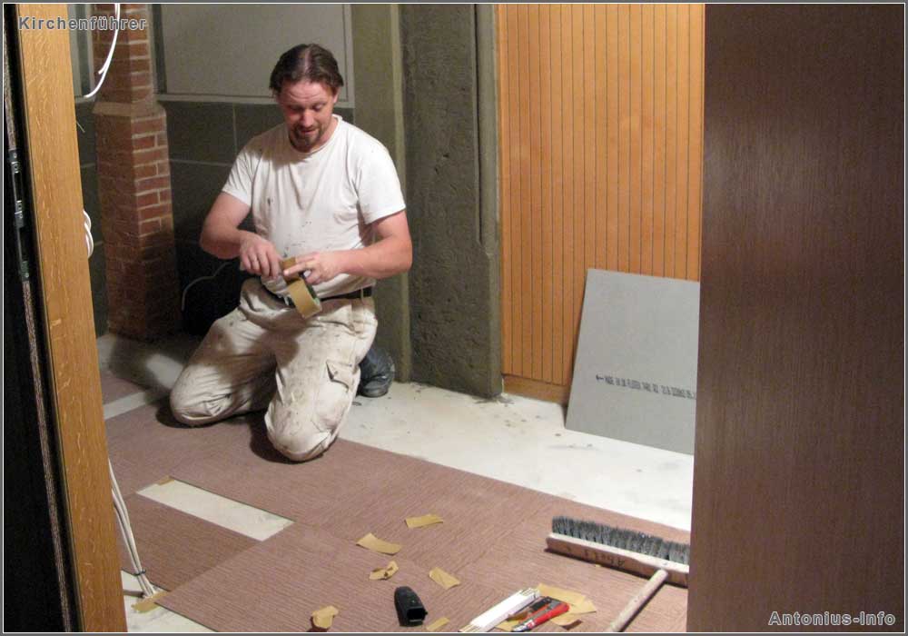 14. September 2009: Im Bereich des nördlichen Seitenportals soll ein Beichtraum entstehen. Hier ist der alte Windfang bereits entfernt worden. Auf dem Foto im Bereich der Kartons ist noch ein Teil der ursprünglichen Kirchenfliesung zu erkennen.