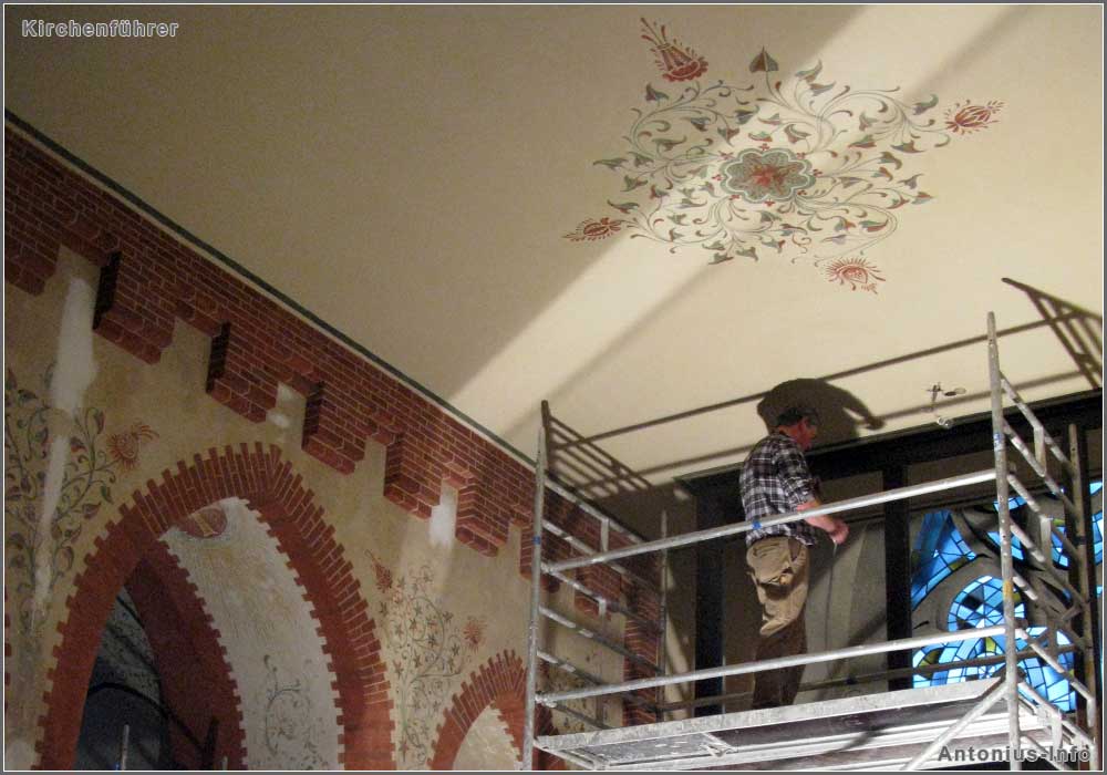 Ein ganz besonderes Projekt der Renovierung 2009 war die Neugestaltung des Eingangsbereichs. Die vom Kirchraum abgetrennte Turmhalle sollte wieder ins diesen integriert werden und die nach dem 2. Weltkrieg übergestrichenen Wandmalereien wieder freigelegt wird.