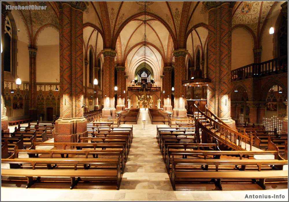 Die St. Antonius Kirche ist eine dreischiffige Hallenkirche. Ein Kirchenschiff ist der Bereich zwischen den Säulen, in denen sich die Sitzreihen befinden. Daraus ergeben sich bei der St. Antonius Kirche ein breites Mittelschiff mit zwei Sitzreihen und zwei schmale Seitenschiffe mit jeweils einer Sitzreihe.