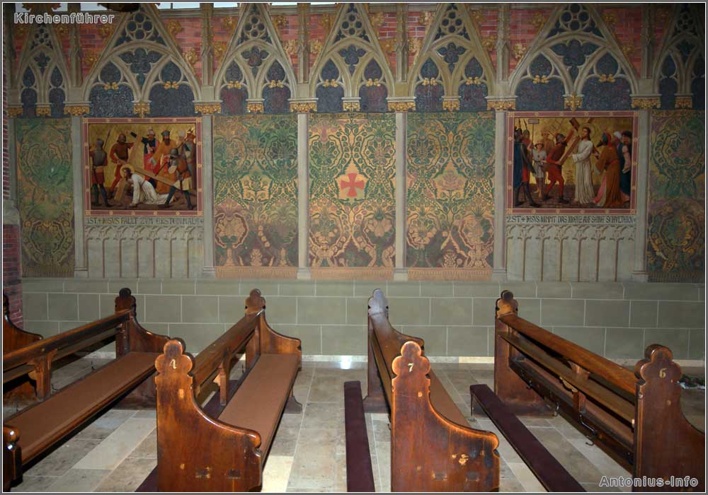 An den Außenwänden der Kirche ist der Kreuzweg angebracht. Diese aufwendig auf Kupferplatten gemalten Bilder schuf der Künstler H. Windhausen aus Roermond im Jahr 1885. Der Kreuzweg beischreibt das Leiden Jesu von der Verurteilung bis zum Tod am Kreuz.