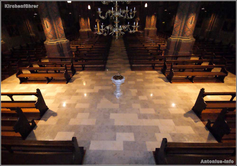 Blick durch den Quergang auf den Taufort. Der Taufstein aus weißem Marmor wurde 1878 von der Fa. Hermann Brassard in Osnabrück hergestellt.
