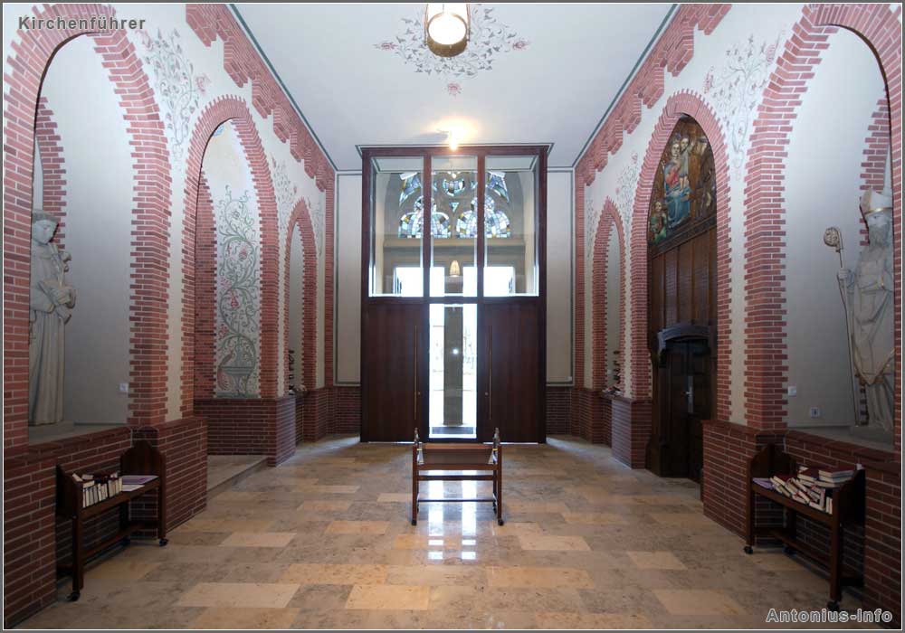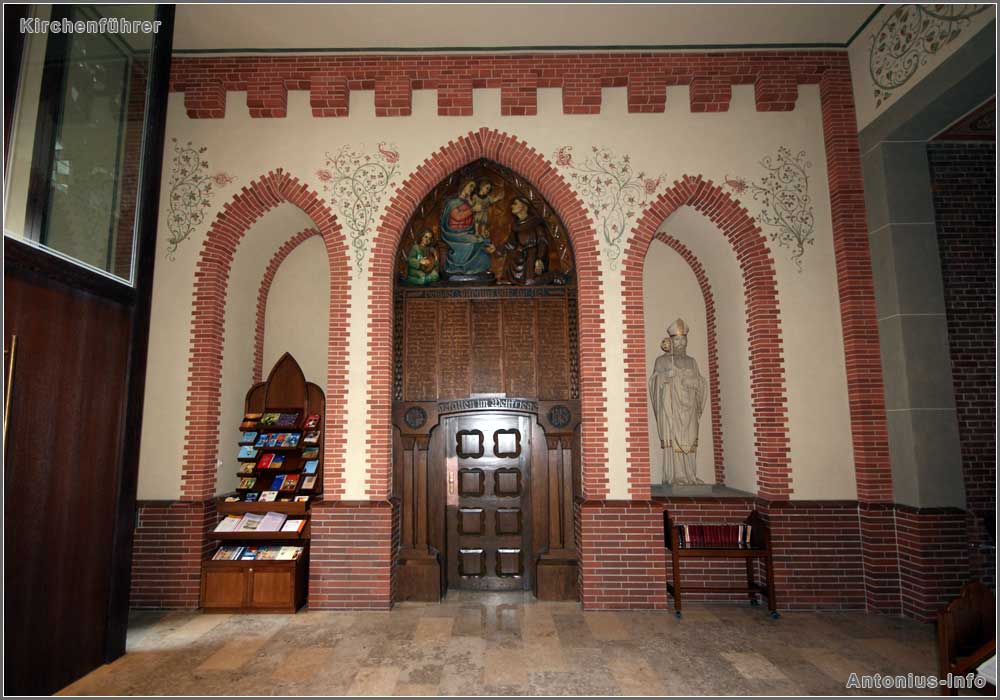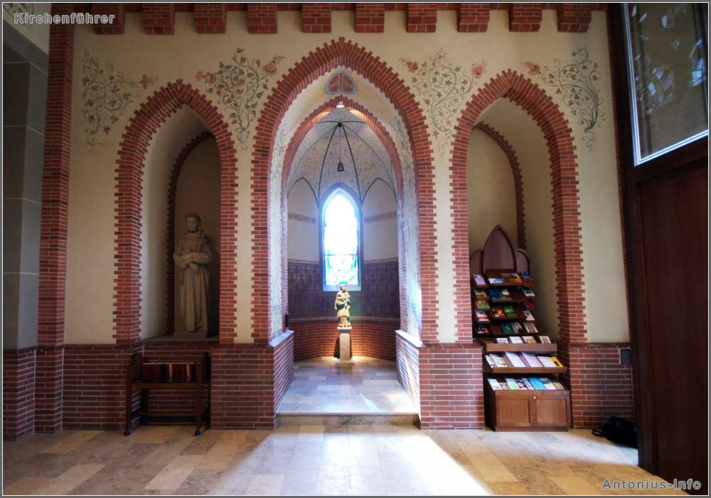 Die südliche Wand: links in der Nische die Antonius-Statue, in der Mitte die Antoniuskapelle und rechts einer der beiden Schriftenstände.