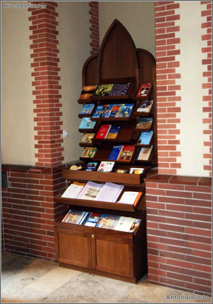 Neben verschiedenen christlichen Zeitschiften, Flyern zu Veranstaltung und zur Information werden dort auch Kirchenführer, Postkarten und Kleinschriften zu den verschiedensten religiösen Themen und Anliegen angeboten. Darüber hinaus können zu den Öffnungszeiten im Pfarrbüro weitere Devotionalien erworben werden.