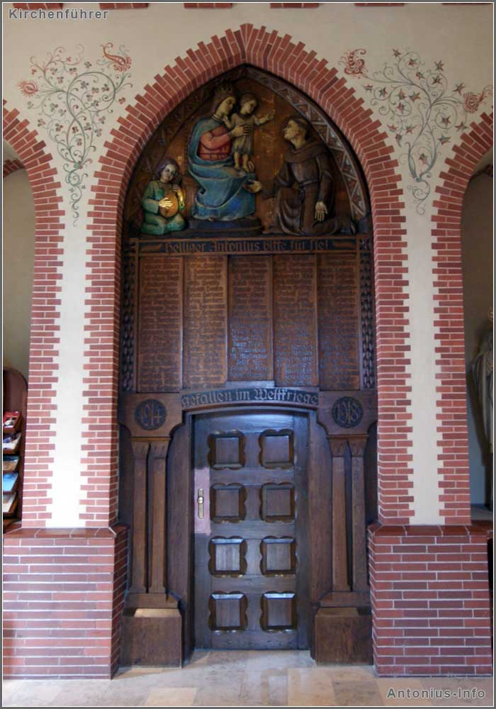 Das Bild zeigt noch einmal den Aufgang zur Orgel mit der Kriegergedächtnistafel (Bildmitte) aus dem 1. Weltkrieg und einer Schnitzerei von dem Künstler Hellerbernd: Sie stellt den hl. Antonius dar mit Maria und dem Jesuskind